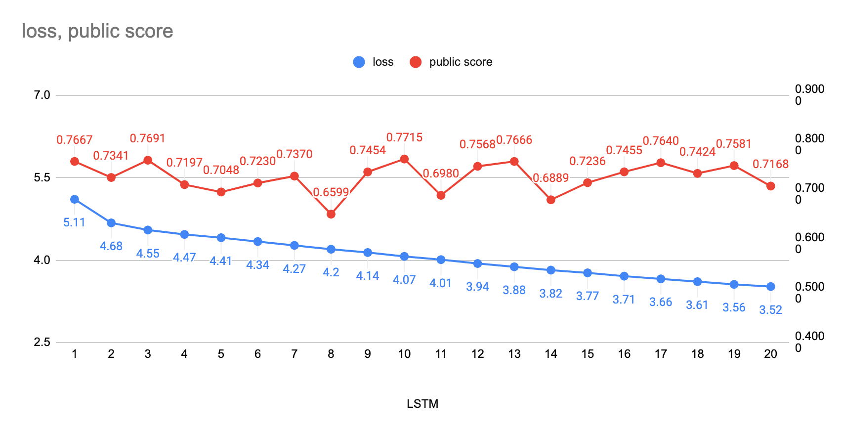: LSTM 모델은 초기 학습에도 좋은 성능(Public score)을 나타냄