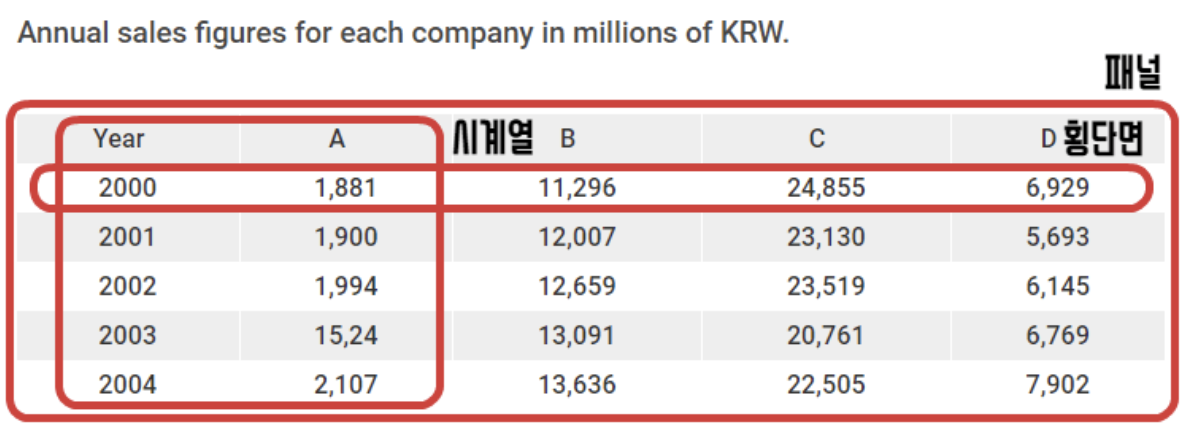 3) 패널 데이터 : 다수시점 + 다수독립변수 (null 존재 불가)