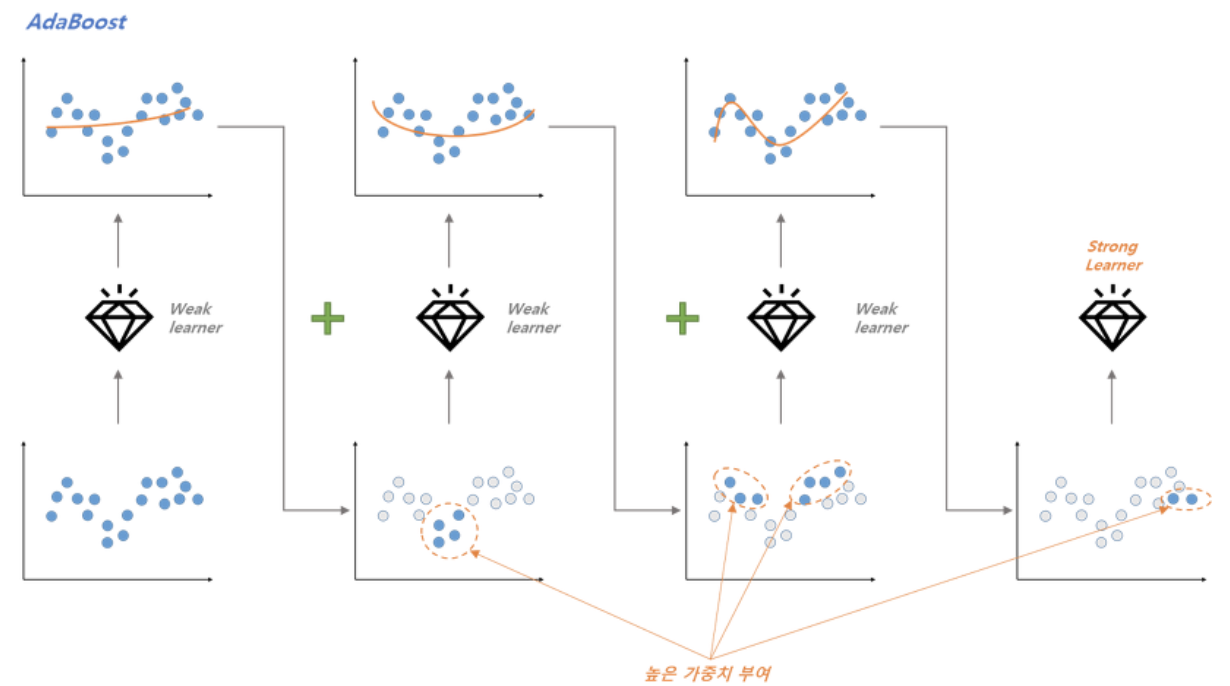 : 앙상블(Ensemble) 방식 중 하나로 성능이 약한 학습기(week learner)를 여러 개 연결하여 강한 학습기(strong learner)로 만들어 감