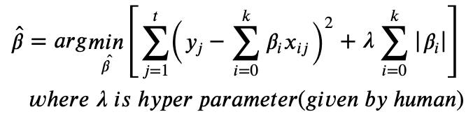 - 가중치(𝛽𝑖βi) 절대값을 최소화 시키기 위에 필요 없는 변수들을 0에 수렴시키려고 최적화 진행