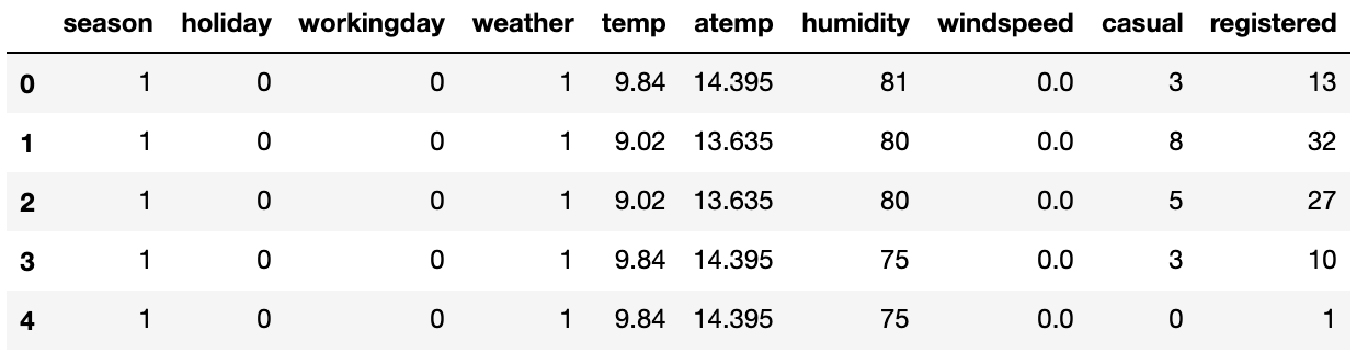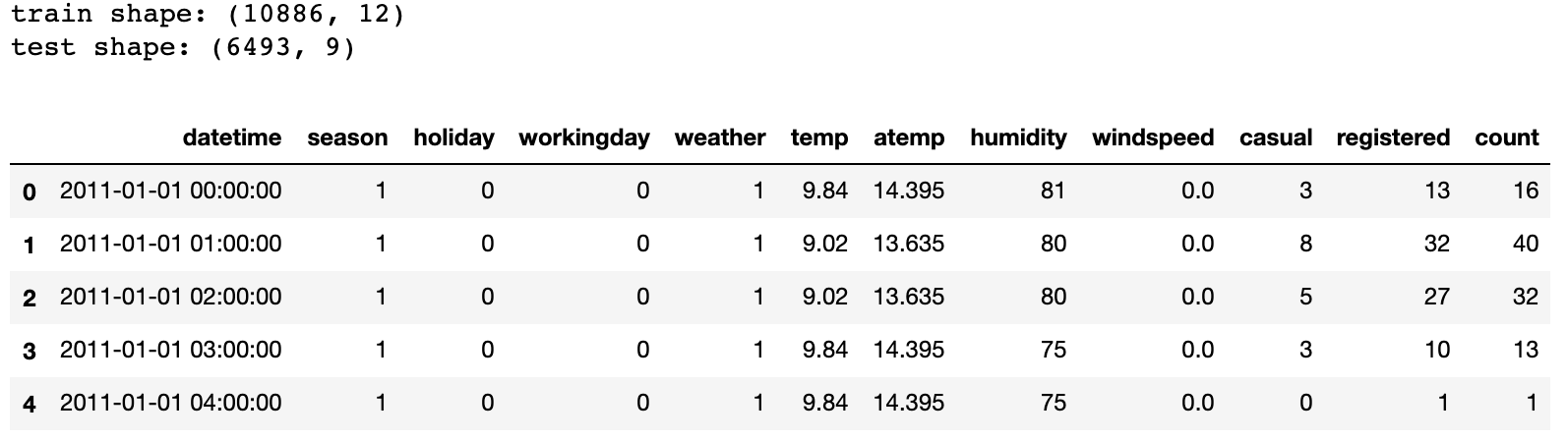 : 학습 데이터의 Shape는 (17379, 12)이며 해당 데이터로 테스트 데이터의 각 시간별 수요량을(count) 예측하는 문제다