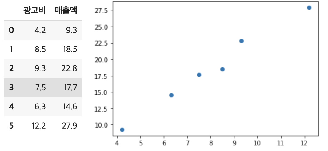 : 위 산점도를 살펴보면 광고비와 매출액의 관계가 우 상향하는 직선의 형태를 보이고 있음