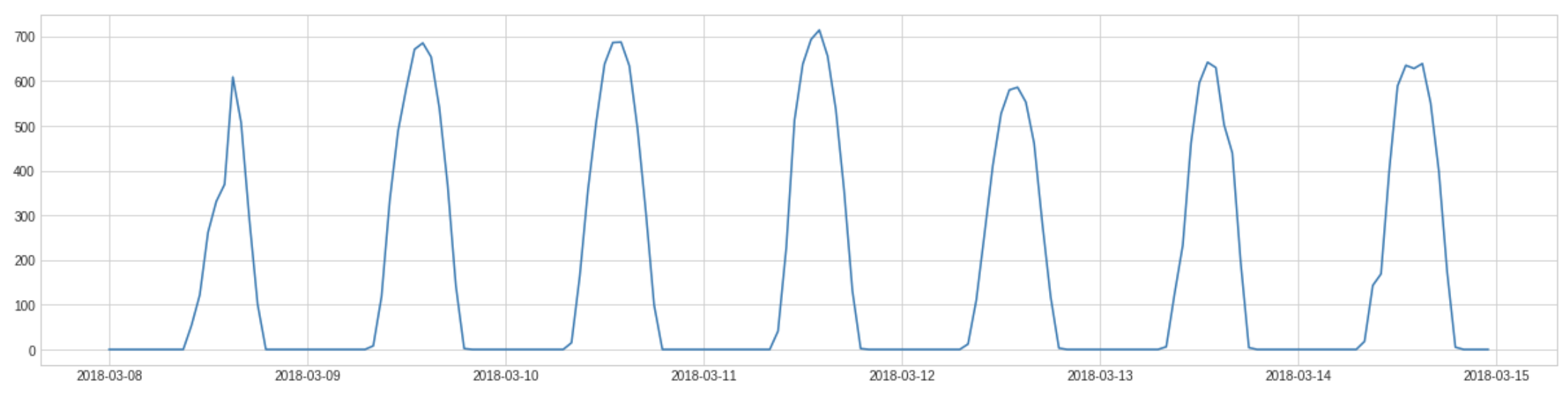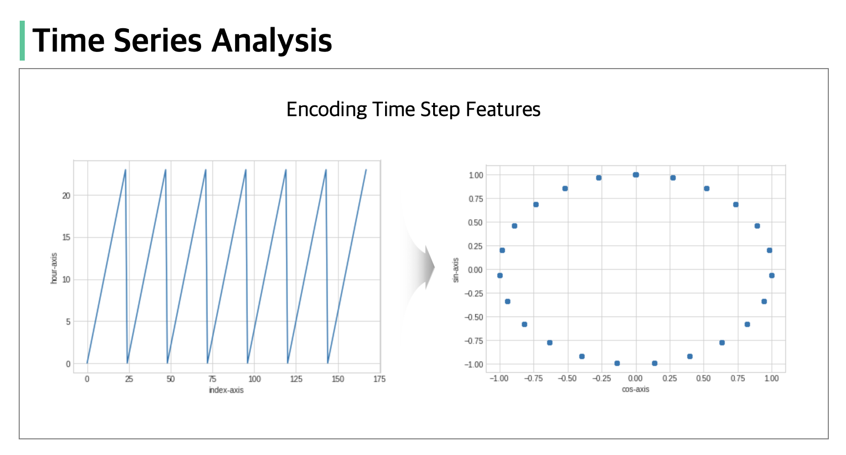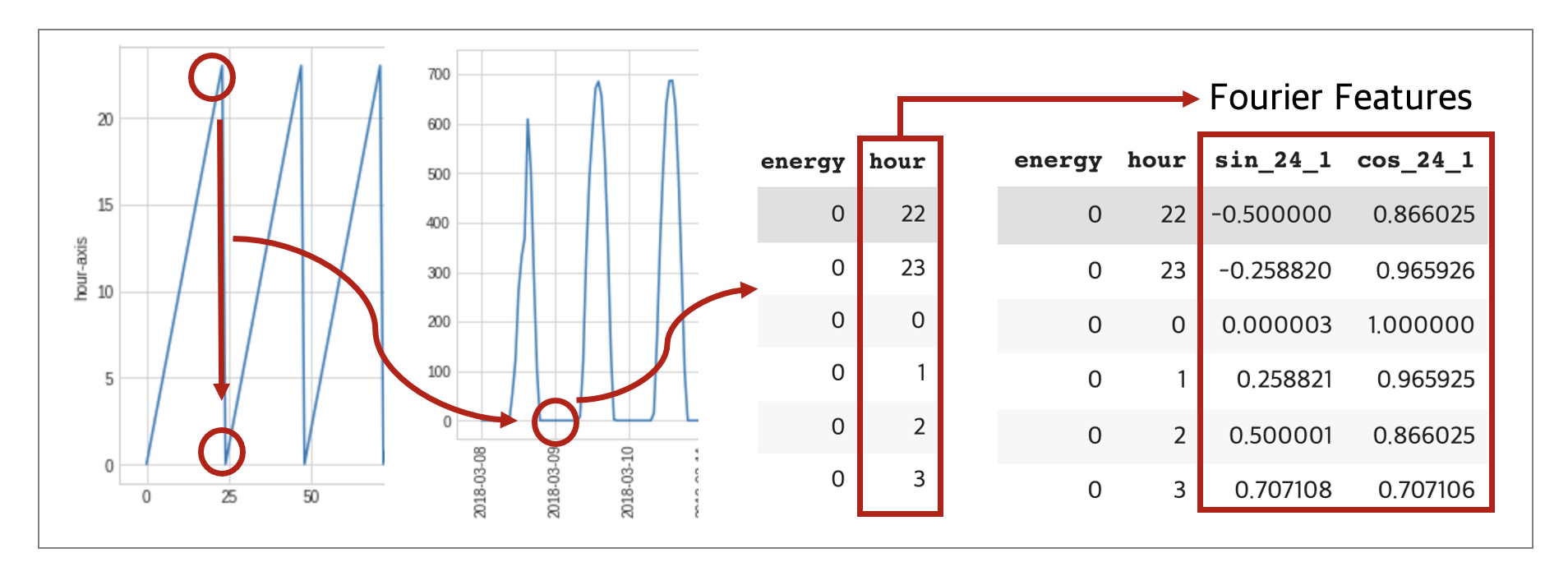 머신러닝 모델에 주기성을 학습하기 위해서 우리는 시간 순차성(Time Step) 특성을 지닌 시간(Hour) 변수를 사전에 시간축에서 생성했습니다. 0~23시 까지 시간이 데이터로 표현됐기 때문에 머신러닝 모델은 이를 연속적으로 증가하는 숫자로 밖에 인식하지 못합니다. 그래서 3월 8일 23시와 3월 9일 0시를 23의 차이로 인식하게 되지만 실제 발전량은 0으로 차이가 없음을 보여주고 있습니다. 이런 시간 데이터를 그대로 머신러닝 모델에 학습하게 되면 연속적인 주기성을 제대로 학습하지 못하기 때문에 우리는 위에서 기술된 푸리에 특징을 사용하여 이를 간단한 요소로 분해하고 데이터가 연속성을 가질 수 있도록 표현합니다.