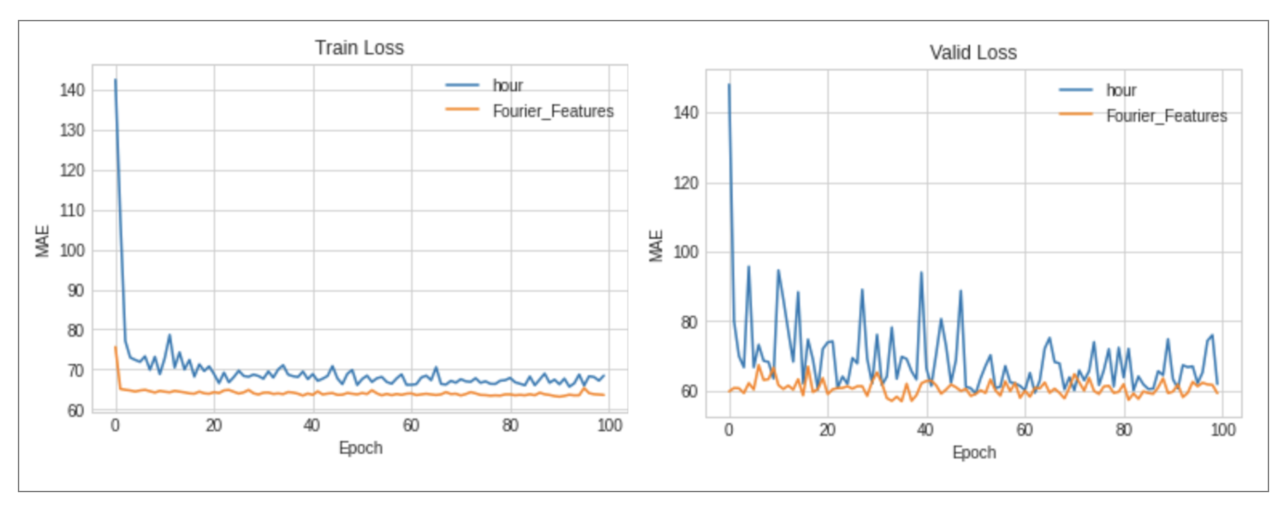 학습 후 두 실험의 결과를 살펴보면 그림에서 모두 푸리에 특징으로 변환했을 때 기존 시간 데이터를 입력하는 것에 비해 상대적으로 MAE가 낮고 수렴이 빠른 것을 확인할 수 있습니다.