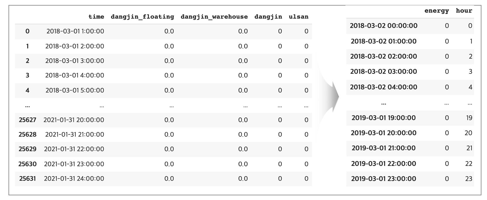 데이터를 살펴보면 18-3-1부터 21-1-31일 까지 약 3년간 시간대별 태양광 발전량에 대한 데이터를 제공하고 있습니다. 간단한 비교 실험을 위해 당진 발전소에서 관측된 1년 치 데이터만 사용하고자 합니다. 시간대별 관측된 데이터이기 때문에 발전량의 주기성을 살펴보기 위해 시간축(=index)에서 시간 변수를 따로 추출하여 이를 같이 살펴봅니다.