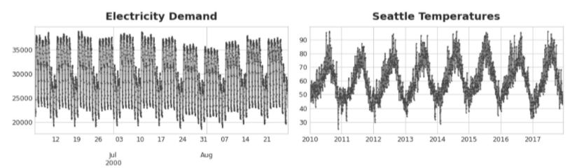 주기적 변동인 계절성을 머신러닝 모델이 잘 이해하고 학습시키기 위한 데이터 전처리가 필요합니다. 1~24시, 월~일, 주 단위의 적은 관측값에서 발견되는 계절성은 특정 요일과 같이 해당 주기 단위를 직접 지시하여 표현하는 방법이 보다 유용하며 1/1~12/31, 위 그림 예시와 같이 년 단위 많은 관측값에서 발견되는 계절성은 푸리에 특징(Fourier Features)을 사용하여 표현하는 방식을 권장합니다.