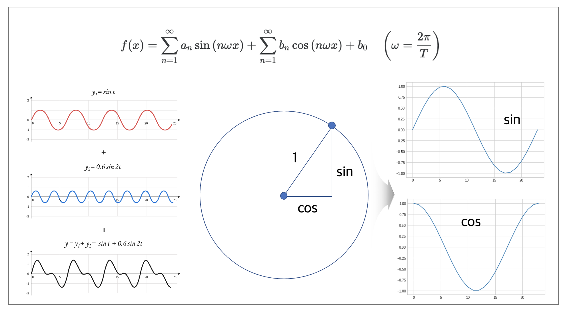 ( 복잡한 주기성 데이터 ) = ( 사인 1 ) + ( 사인 2 ) + ( 코사인 1 ) + ( 코사인 2 ) +....