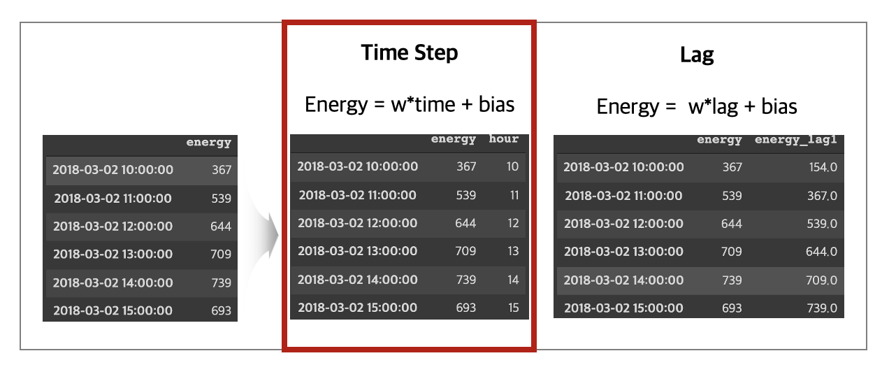 시계열 데이터에는 일반적으로 시간 순차성(Time Step)과 지연값(Lag)이라는 고유한 2가지 특성이 존재합니다. 두 특성 모두 시간 축을 바탕으로 발생하며 시계열 문제를 머신러닝 모델로 접근하고 해결하기 위해 유용한 특성입니다. 첫번째, 시간 순차성(Time Step)은 시간축에서 직접 추출 가능하며 시작부터 끝가지 일정 시간 간격으로 측정된 년, 월, 일, 시간 특성이 대표적입니다. 이는 관측값이 주기적 성질을 지니고 있을 때 유용한 특성입니다. 두 번째, 지연 값(Lag)은 관측값에 시간 차이로 발생되며 현재 관측값들은 이전 관측값들로 표현됩니다. 이는 관측값이 자기 상관 또는 계열 상관성을 지니고 있을 때 유용한 특성입니다.