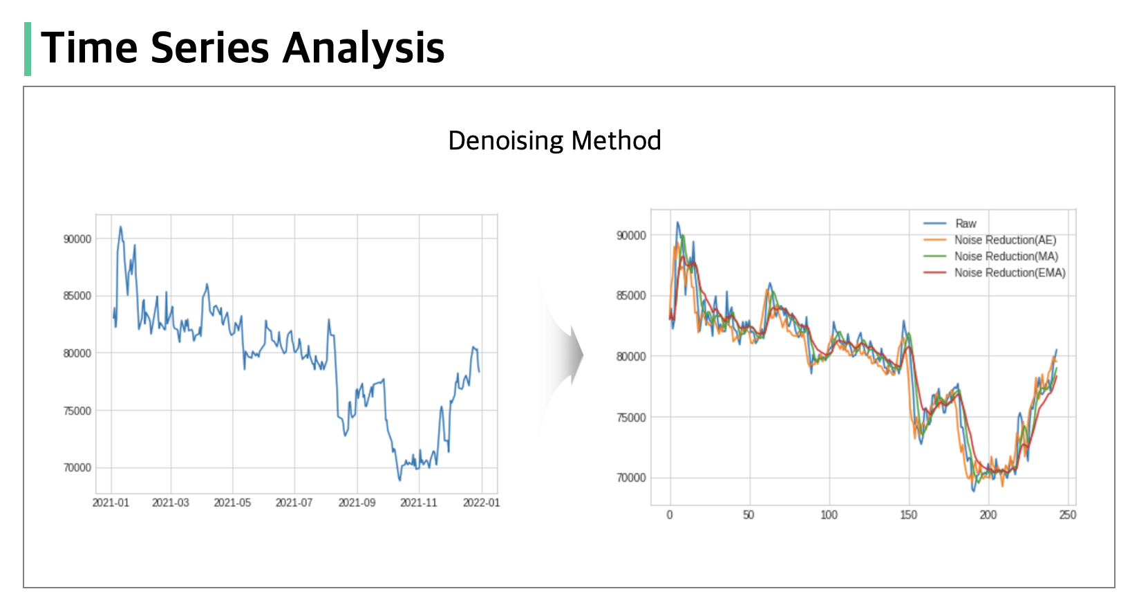 해당 방법들을 통해 재 생성된 데이터들의 정보와 잡음이 어떻게 분포되어 있는지 시각화 자료로 살펴보면, 단순 이동평균(MA)과 지수 이동평균(EMA)은 기존 데이터에 비해 스무딩 된 표현을 얻었습니다. 하지만 여전히 큰 분산을 보이고 있어 이를 활용 시 성능 향상에 도움이 될지 알 수 없습니다. 다음으로 푸리에 변환(FFT)을 살펴보면 기존 방법들에 비해 더 부드러운 표현을 가지게 되었고 많은 잡음이 제거된 것으로 보입니다. 웨이블릿 변환(WT)은 푸리에 변환보다 더 부드러운 파동의 형태를 지니게 되어 기존 잡음과 더불어 정보까지 같이 손실된 것처럼 보입니다. 이는 모 웨이블릿을 어떤 걸 사용하느냐에 따라 큰 차이가 발생할 수 있으므로 여러 실험을 통해 알맞은 함수를 찾아야 잡음 제거 효과를 얻을 수 있습니다. 마지막으로 오토 인코더(AE)의 경우 기존 데이터와 푸리에 변환 중간쯤의 표현력을 지닌 것으로 보입니다.