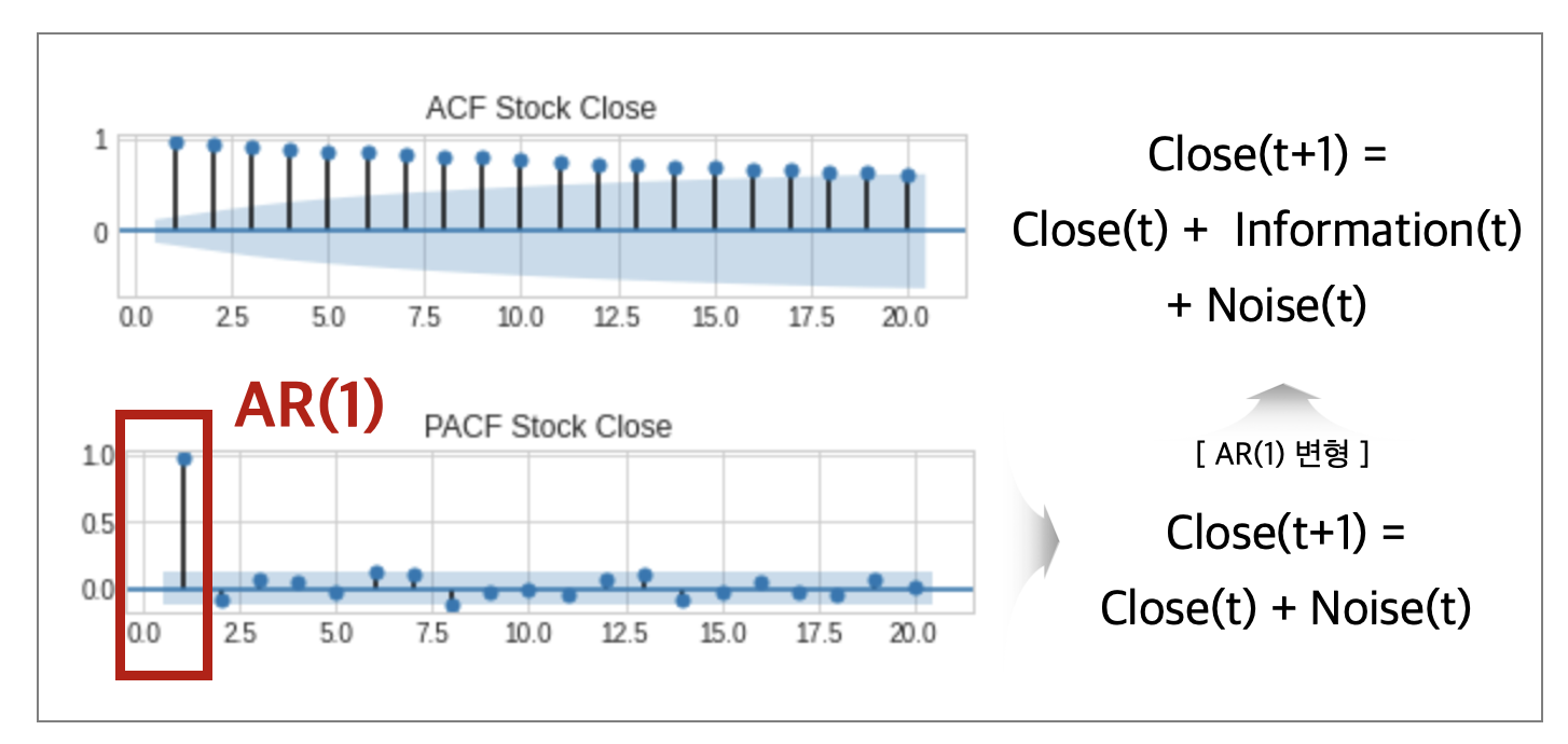 예제로 가져온 주식 종가 데이터를 ACF/PACF로 살펴보니 AR(1)의 특성을 보이고 있습니다. 금융 공학에서는 기하 브라운운동(GBM)을 가정하여 주식 종가 예측 모형을 진행하는데 AR(1)과 근본적으로는 유사하기 때문에 이를 바탕으로 모형을 변형하여 표현할 수 있습니다. 변형된 AR(1) 공식을 살펴보면 다음 주식 종가(t+1)는 현재 주식 종가(t) + 정보(t) + 잡음(t)으로 구성되어 있고 현재 주식 종가(t)를 좌변으로 옮기면 정보(t)와 잡음(t)을 살펴볼 수 있습니다.