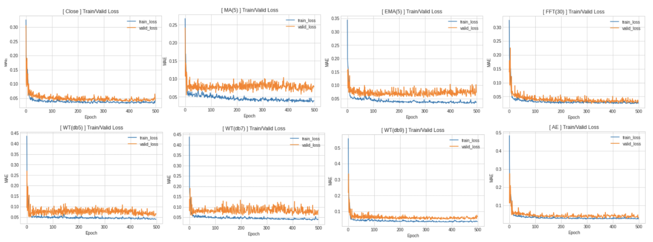 잡음 제거가 잘 되었는지 확인하는데 편차의 분포를 보는 것보다 예측 모델로 실험 결과를 보는 게 가장 정확하고 평가할 수 있습니다. 비교 결과 푸리에 변환(FFT)이 가장 좋은 성능을 지니고 있었고 그다음으로는 오토 인코더(AE) 모델이 잡음 제거로 인해 좋은 성능을 보이고 있습니다. 그에 반해 이동평균(MA, EMA) 방법들은 과거의 결과 자료로써 데이터를 재 구성하는 방법이기 때문에 후행 예측이 여전히 존재하고 있는 것을 눈으로 확인할 수 있었으며 검증 데이터의 학습이 제대로 진행되지 않는 것을 볼 수 있습니다. 웨이블릿 변환(WT)의 경우 후행 예측 문제를 해소할 수 있으나 변환 작업에서 신호의 잡음과 정보를 같이 손실되어 정확도를 잃게됐습니다. 하지만 예측 결과를 살펴보면 추세를 판단하기에 좋은 방법이라고 생각되어집니다.