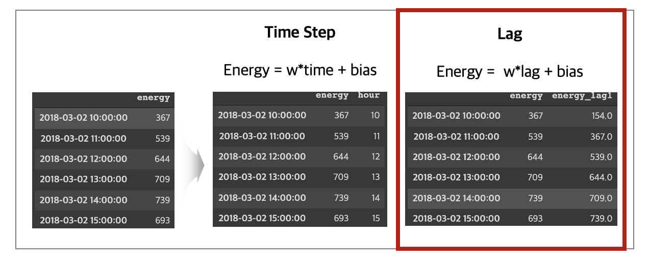 시계열 데이터에는 일반적으로 시간 순차성(Time Step)과 지연 값(Lag)이라는 고유한 2가지 특성이 존재합니다. 두 특성 모두 시간 축을 바탕으로 발생하며 시계열 문제를 머신러닝 모델로 접근하고 해결하기 위해 유용한 특성입니다. 첫 번째, 시간 순차성(Time Step)은 시간축에서 직접 추출 가능하며 시작부터 끝가지 일정 시간 간격으로 측정된 년, 월, 일, 시간 특성이 대표적입니다. 이는 관측값이 주기적 성질을 지니고 있을 때 유용한 특성입니다. 두 번째, 지연 값(Lag)은 관측값에 시간 차이로 발생되며 현재 관측값들은 이전 관측값들로 표현됩니다. 이는 관측값이 자기 상관(AutoCorrelation) 또는 계열 상관성(SerialCorrelation)을 지니고 있을 때 유용한 특성입니다.