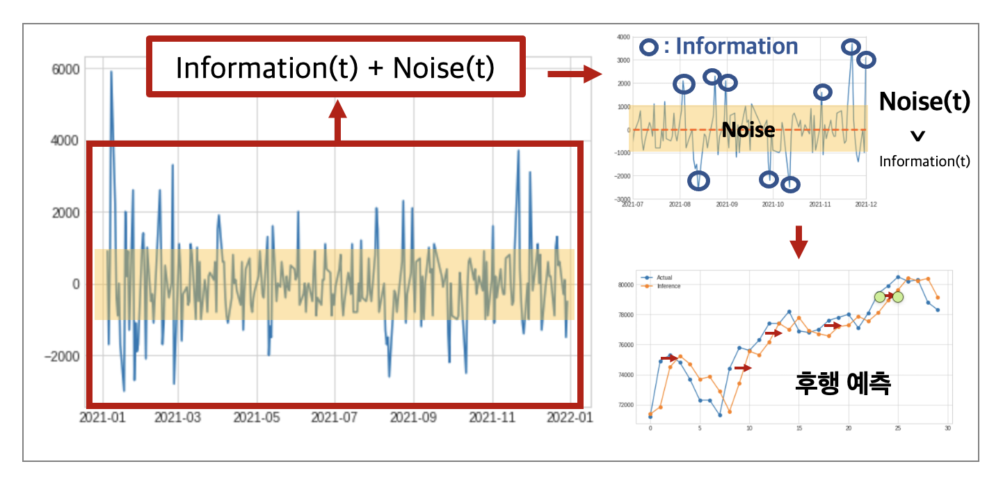 시간에 따른 정보(Information)와 잡음(Noise)을 살펴보면 규칙성이 없고 분산이 일정하지 않습니다. 등분산성이 가정되지 않는다면 비정상 시계열이라 표현되며 이때 잡음(Noise)이 정보(Information)에 비해 상대적으로 더 큰 영향을 미치게 됩니다. 이로 인해 좋은 정보량을 잡음으로 인해 잃게 되고 다음 종가(t+1)는 현재 종가(t)와 잡음(t)으로 구성된 것처럼 설명되기에 예측 모델이 잔차를 최소화하기 위해 후행 예측을 야기하게 됩니다.