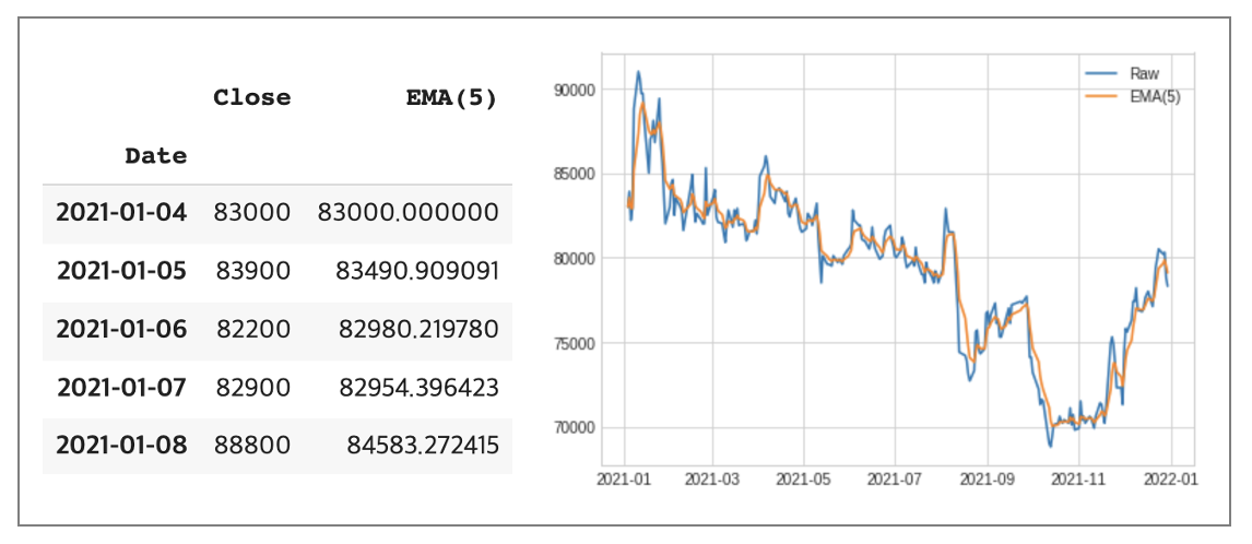 다음은 지수 이동평균입니다. 지수이동평균은 최근값에 가중치를 주며 이동평균을 계산합니다. 이때 평활 계수(EP = 2/(기간+1)를 사용하여 지수이동평균을 계산하게 됩니다. 지수이동평균 = (종가(t) x EP) + (지수 이동평균(t-1) x (1-EP))