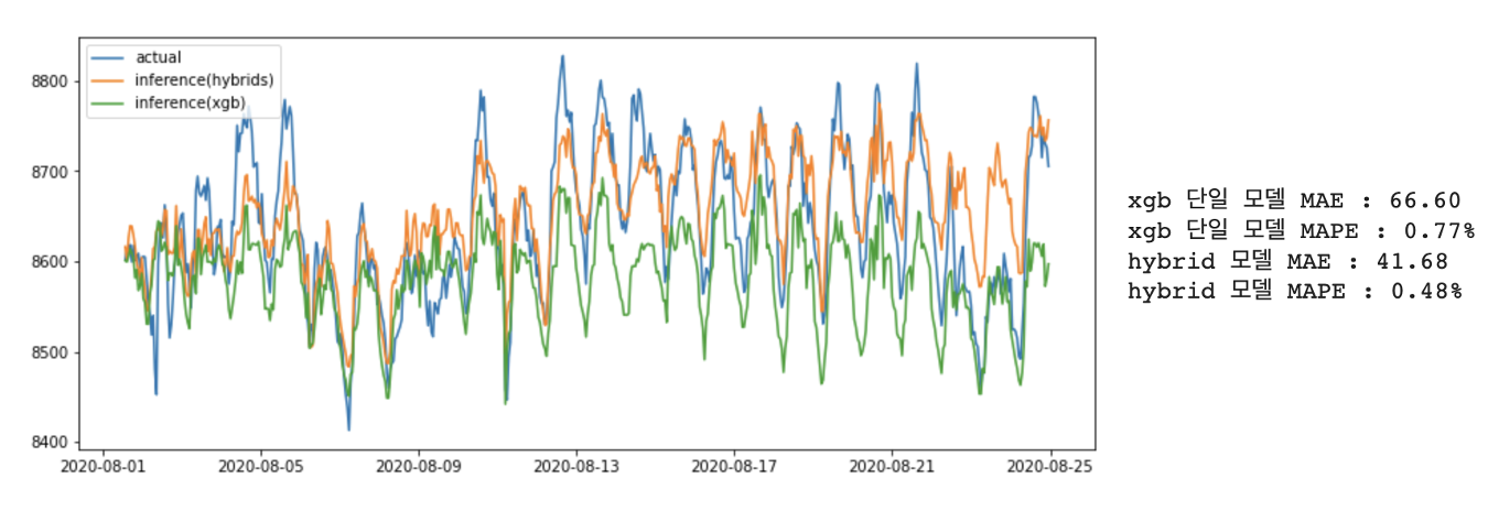 이제 Stacked Hybrids Model의 예측값은 추세 예측 값에 계절성 예측값을 더하면 됩니다. 2개의 모델 특징을 활용한 모델이 좋은 성능을 보여주는지 확인하기 위해 XGB 단일 모델로 학습한 결과와 비교해서 살펴보겠습니다. 평가 지표로는 MAE와 MAPE를 사용한 결과 Stacked Hybrids Model이 단일 XGB Model 보다 MAE, MAPE 모두 우수한 것을 확인했습니다.