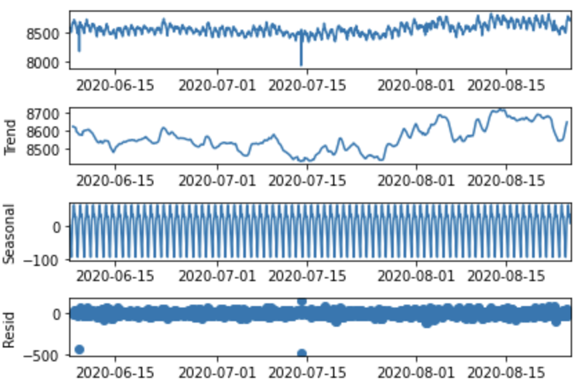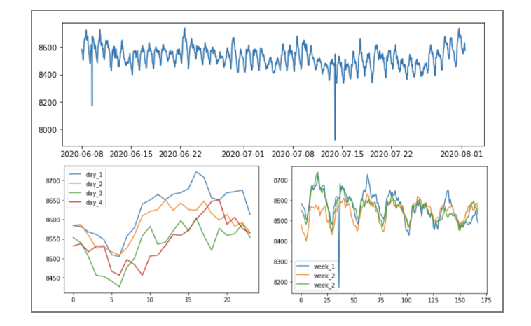 해당 데이터는 약 2달 동안의 짧은 시계열 데이터 이기 때문에 장기적으로 살펴보는 주기(Cycle)를 제외한 추세와 계절성만 살펴봤습니다. 우선 추세의 경우 다소 감소했다가 다시 증가하는 추이를 보이고 있으며 계절성의 경우 오전부터 증가하기 시작해 저녁에 감소하는 일 단위와 평일엔 다소 감소하는 주 단위로 나타나고 있습니다. 이와 같은 큰 변동이 없는 간단한 데이터는 트리 기반 부스팅 모델만을 사용해도 좋은 성능의 모델을 만들 수 있습니다.