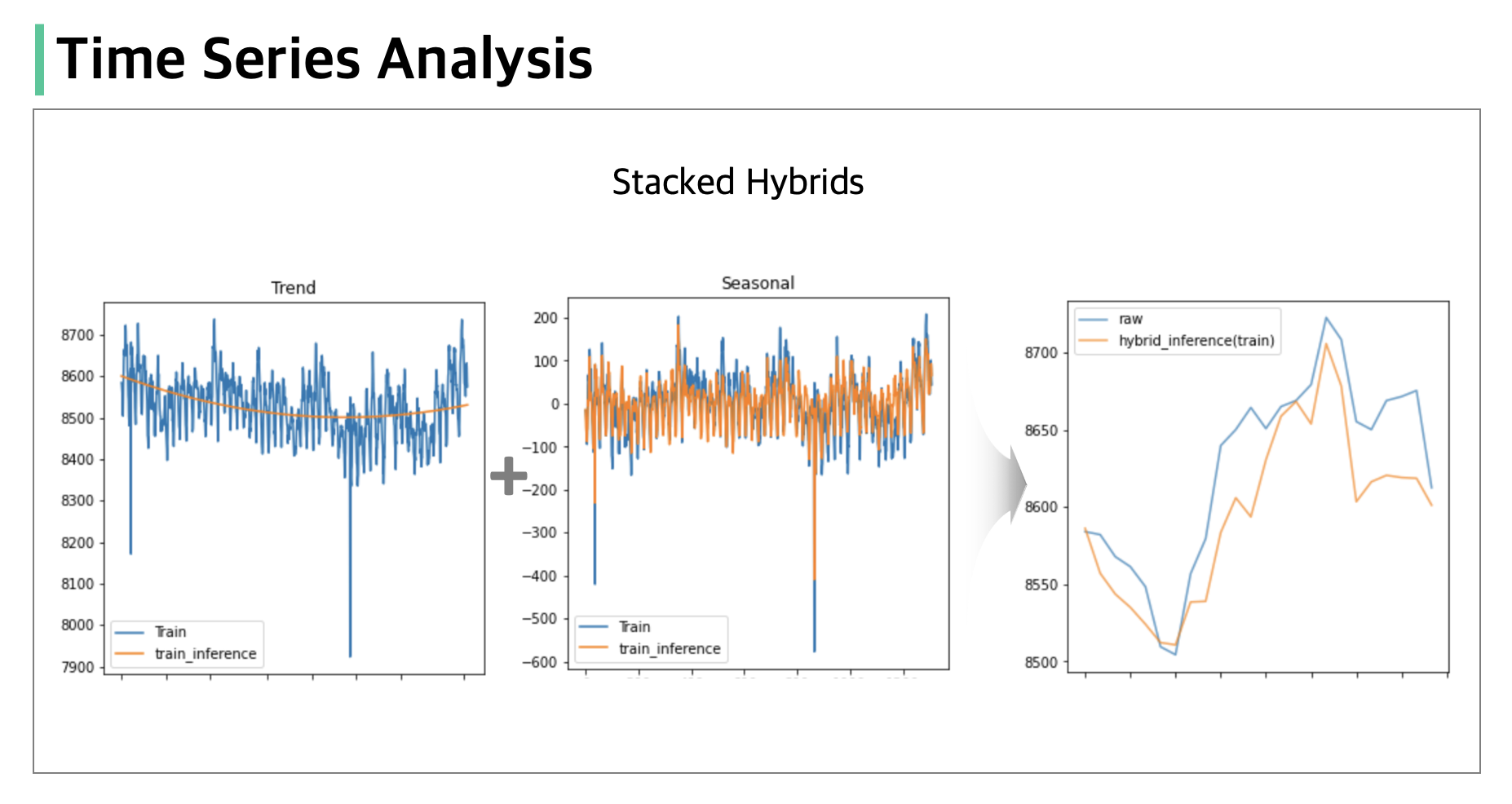 하지만 우리가 학습시키는 데이터가 6월부터 8월까지만 존재하며 앞으로 예측해야 하는 시점의 전력 사용량이 증가하는 추세(여름 전력 사용량 증가)를 지니고 있다면 실제 전력량에 비해 과소 추정밖에 하지 못할 것입니다. 그래서 추세를 선형 회귀 모델로 먼저 학습시키고 시계열 데이터에 추세를 제거한 데이터(=계절성 패턴)를 트리 모델로 학습시켜 두 모델의 예측 결과를 합쳐 사용하면 문제를 해결할 수 있습니다. 이런 방법이 매우 기초적인 Stacked Hybrids 모델 구조입니다.