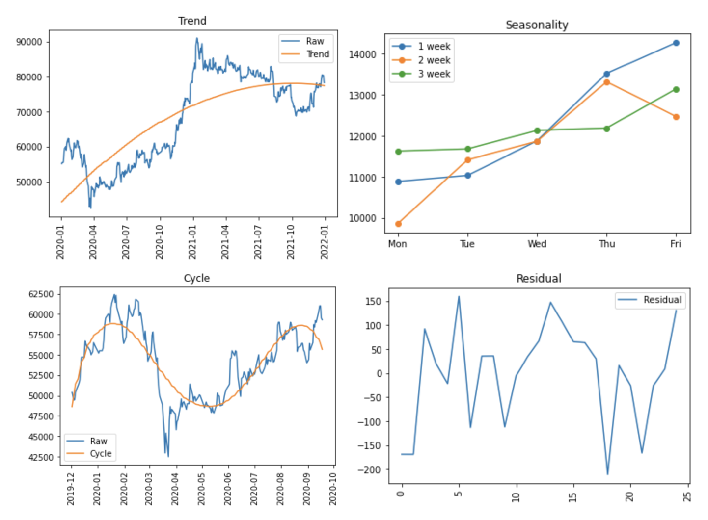 우선 추세를 살펴보면 평가 데이터는 가장 최근의 데이터를 사용해야 미래 예측 시점의 분포와 가장 유사할 것으로 보입니다. 다음으로 계절성을 살펴보면 월요일에서 금요일로 갈수록 종가가 증가하는 패턴을 보이고 있어 모델에 학습 데이터를 최소 한 주 이상 밀어넣어줘야 모델이 패턴을 보다 잘 이해할 수 있을 것 같습니다. 그리고 주기를 보면 두번의 변곡점이 존재하는 것으로 보여 각 분포에 따른 모델을 별도로 만들어야 될 수도 있을 것 같습니다.