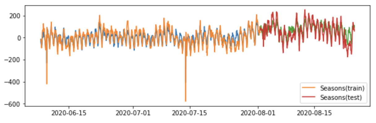 다음은 계절성을 XGB 모델을 사용하겠습니다. 이때 중요한것은 기존 설명변수들과 학습 데이터에서 추정한 추세를 제거한 데이터로 모델에 학습시켜야 합니다. 계절성 또한 그림을 통해 잘 학습된 것을 살펴볼 수 있습니다.