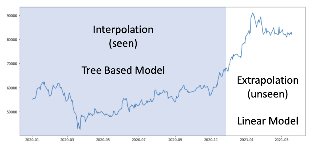 또한 증가하는 추세로 보아 예측해야 하는 시점은 과거에 보지 못한 값이 존재할 수 있을 것으로 보이며 이에 내삽(interpolation)이 아닌 외삽(extrapolation)가능한 모델을 선택해야 할 것입니다. 여기서 내삽이란 주어진 데이터 내에서 추론 가능한 것을 의미하며 트리 기반 예측 알고리즘은 대표적인 내삽만 가능한 모델입니다. 반대로 외삽은 주어진 데이터 외에서 추론 가능한 것을 의미하며 추세선을 학습하는 선형 모델 알고리즘들이 대표적인 외삽이 가능한 모델입니다.