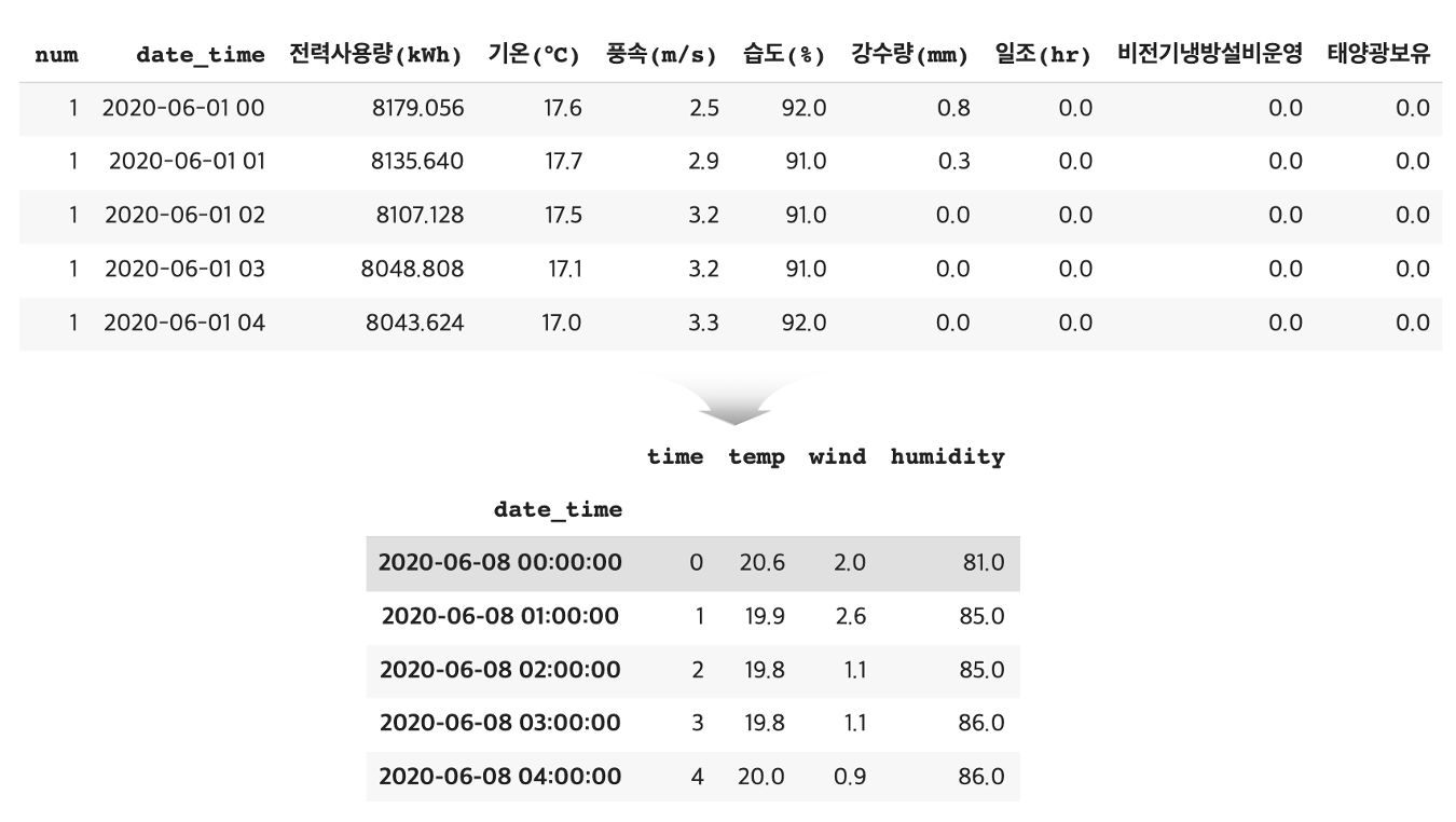 예제를 위해 데이콘에서 진행되었던 전력사용량 예측 AI 경진대회 데이터를 가져왔습니다.