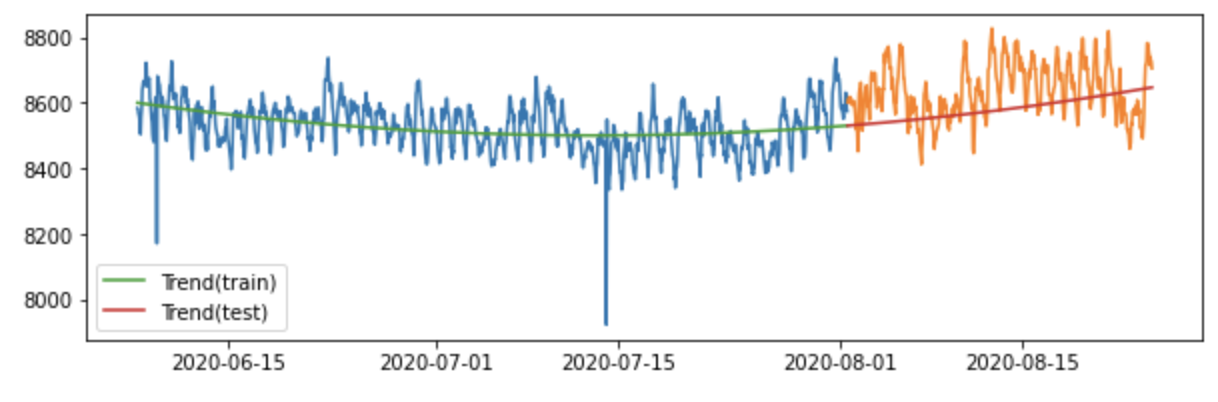 우선 시계열 데이터의 추세를 학습하기 위해 다항추세모형을 사용하겠습니다. 전력 사용량 데이터를 살펴보니 1차 추세로는 학습시키기 어려울 것으로 보이기 때문에 2차 추세 모형으로 학습시키겠습니다. 그림을 통해 학습 데이터로 추정한 추세선이 예측 데이터에도 잘 피팅 된걸 확인할 수 있습니다.